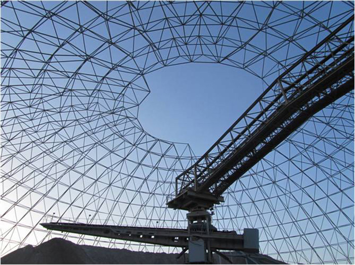 江蘇華海鋼結構有限公司承建的菲律賓電廠煤棚,網(wǎng)架跨度為115米,高度為35米,網(wǎng)架表面防腐環(huán)氧富鋅底漆+PU面漆